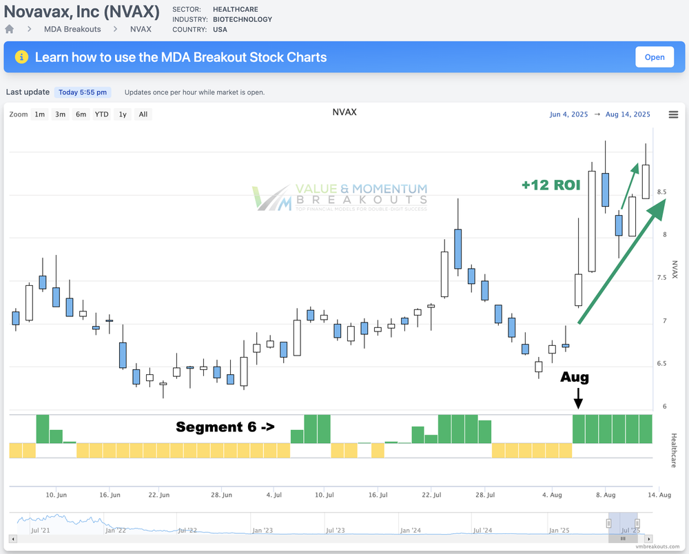 Picked as an MDA Breakout NVAX runs up 12% returns in the five days after. Updates on DAN and more picks from Aug 6th.
