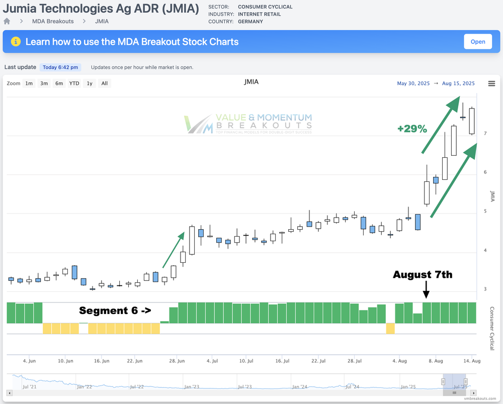 Opendoor Technologies inc, OPEN, as we all know the hype surrounding $OPEN... Well can't say we knew all that would happen, but breakouts are kinda what we do here. After its run up in July, $OPEN settled around 2 bucks, entering back into Segment 6 on the 11th. From $2.10 -> $3.78 in five days for an 80% return on investment. We track picks five days out but that doesn't always mean your trade needs to end there, timing is everything!