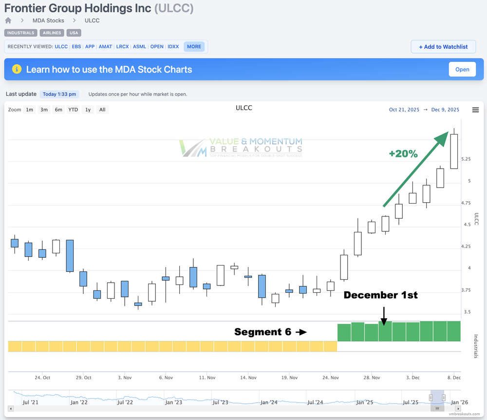 Warner Bros. Discovery, $WBD, makes its move with a 12.5% gain in five trading days from $24.53 to $27.60 after its MDA Breakout selection on December 2nd, closing out the move by December 9th! A solid $3.07 per share gain for the global media and entertainment powerhouse. The pop comes right on the news of a possible Netflix, $NFLX, acquisition for a few billion dollars.